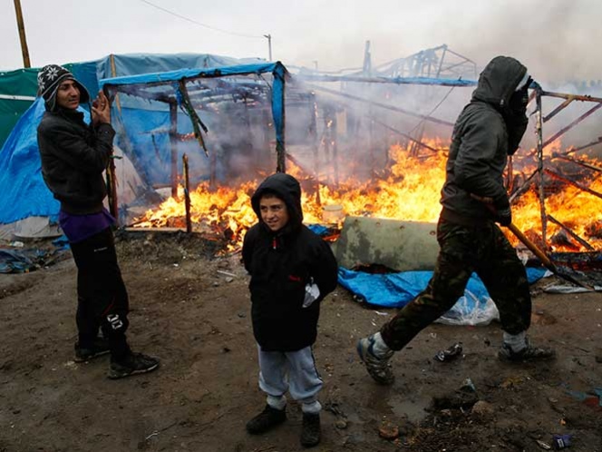 Migrantes y sus defensores protestaron el martes contra el desalojo; algunos subieron a los techos de los cobertizos para frenar brevemente las demoliciones, mientras otros causaron un incendio durante la noche en el lugar.