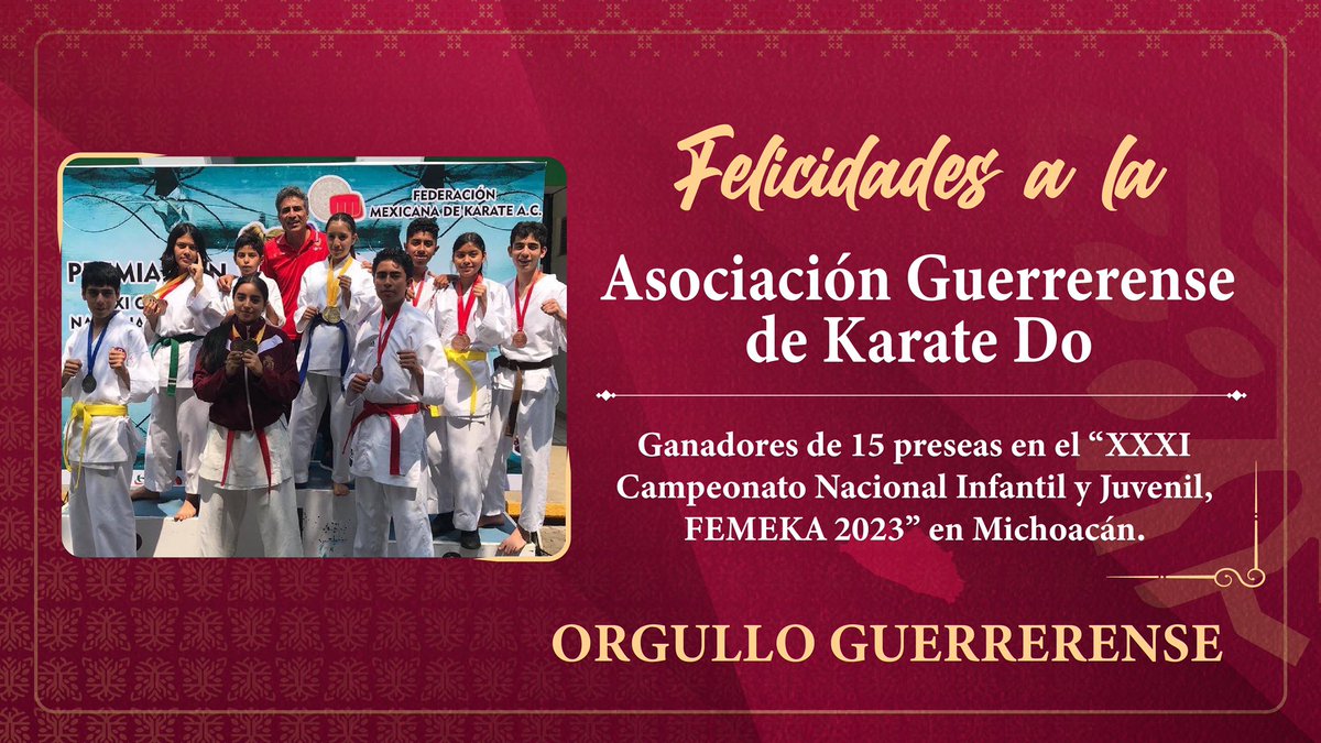 La Asociación Guerrerense de Karate Do (AGK), triunfó en el XXXI Campeonato Nacional Infantil y Juvenil, FEMEKA 2023 en Morelia, Michoacán con 15 preseas. El evento no solo se limitó a la competencia en combate y formas, sino que también hubo seminarios para jueces, entrenadores y atletas.